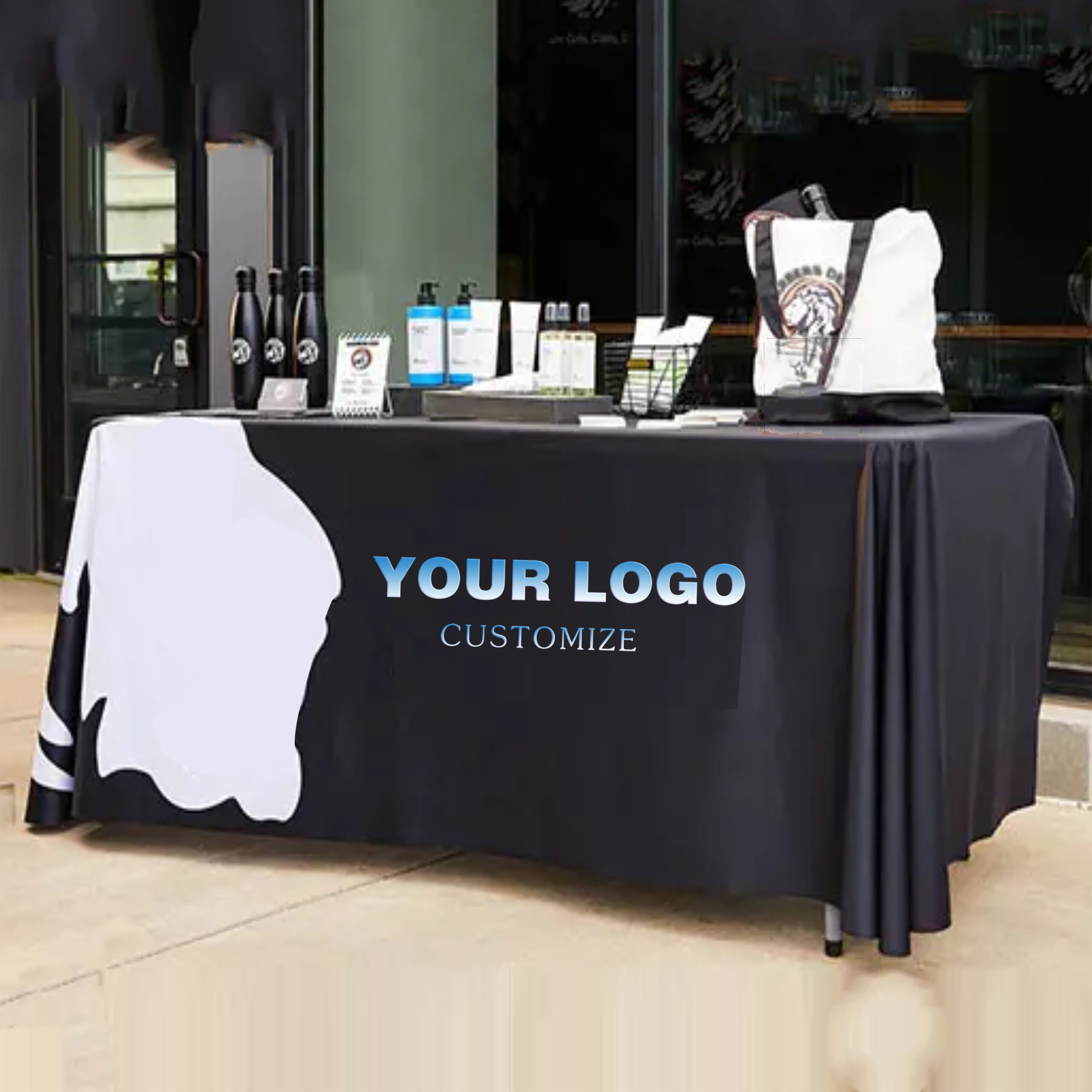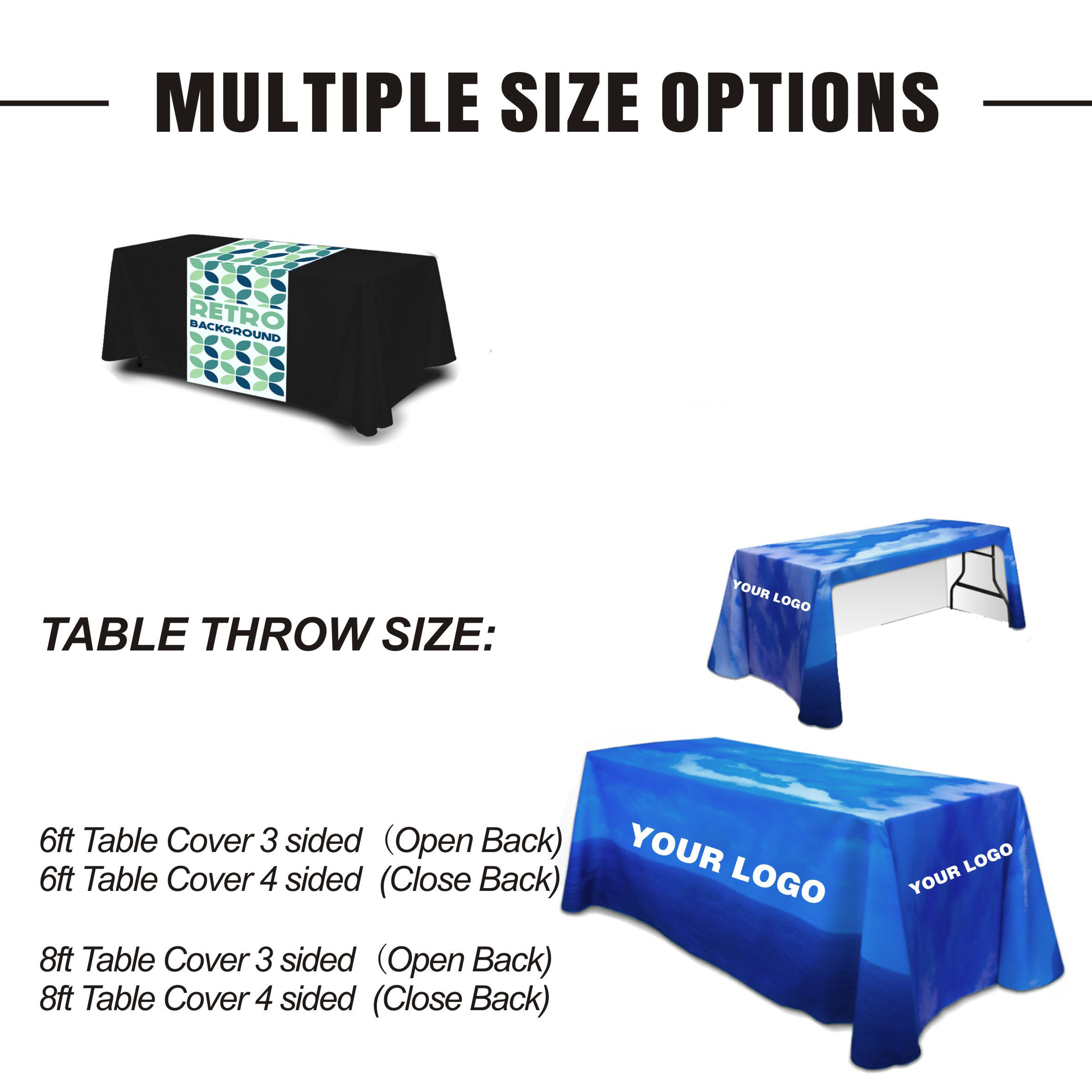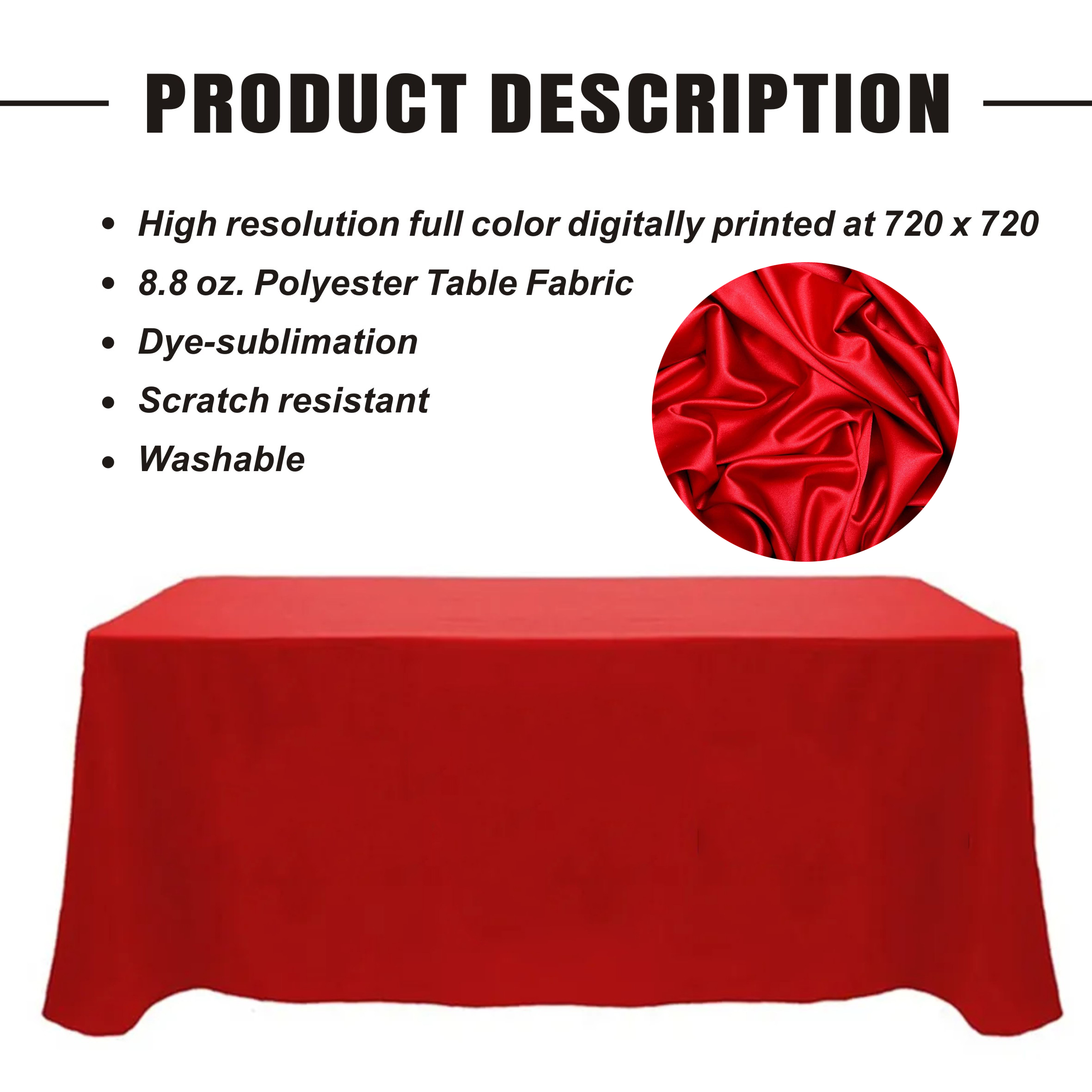 Excellent table topper for trade shows, exhibitions, and any presentations. Our table covers are dye sublimated and are 100% washable if it ever gets dirty. This table cover is made from our 8.8 oz. polyester table fabric that drapes over 3 sides of a 48″ x 30″ x 30″ display table. The table cover is sewn with rounded corners and hang approximately 2″ above the floor. Complete your presentation with our simple and cost-effective table cover.